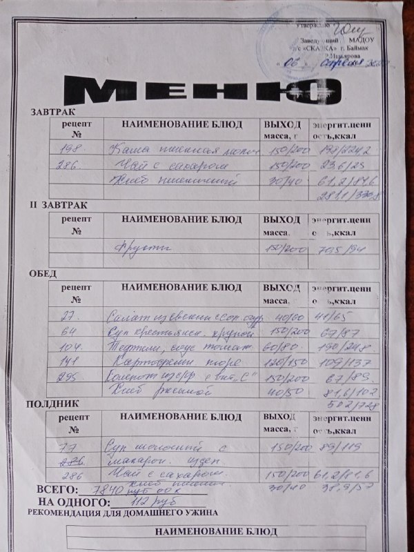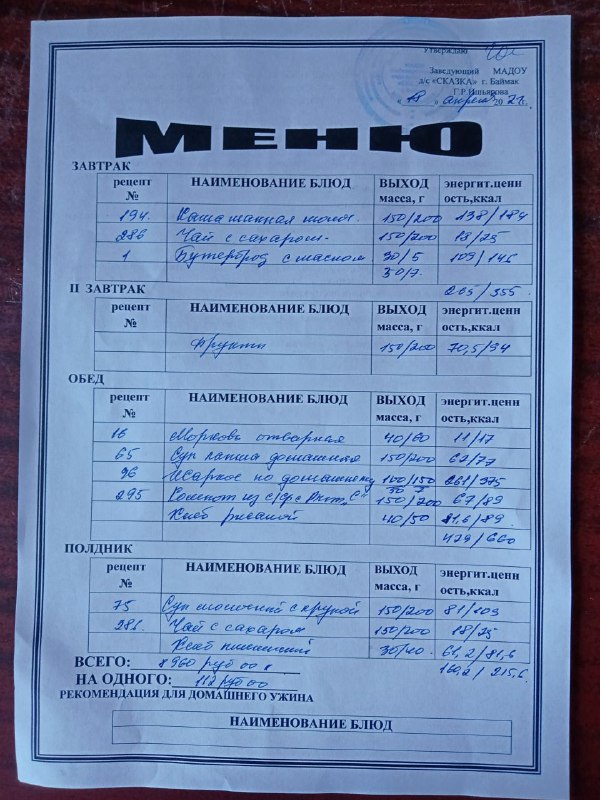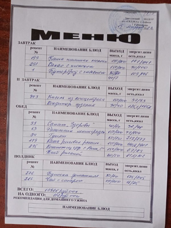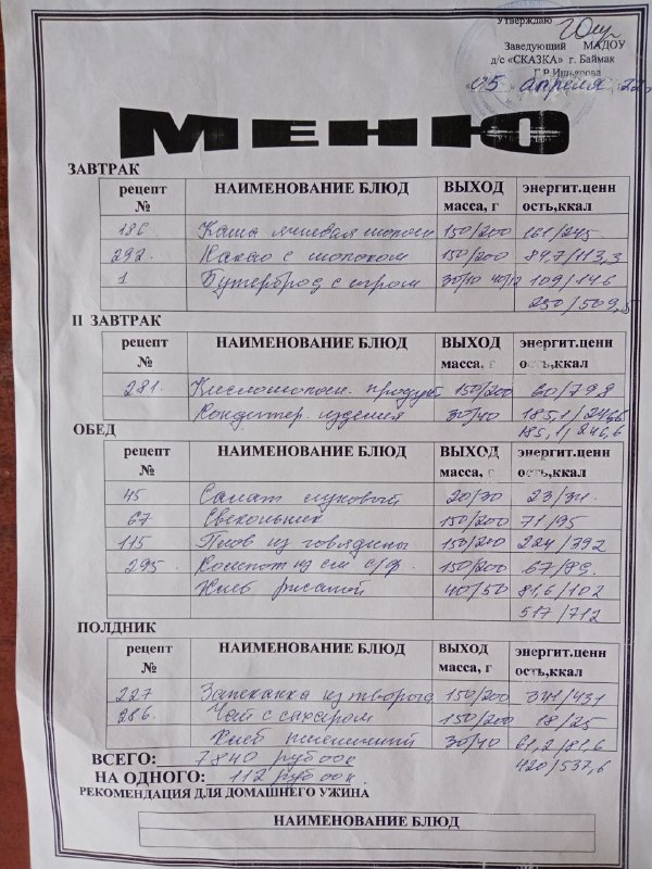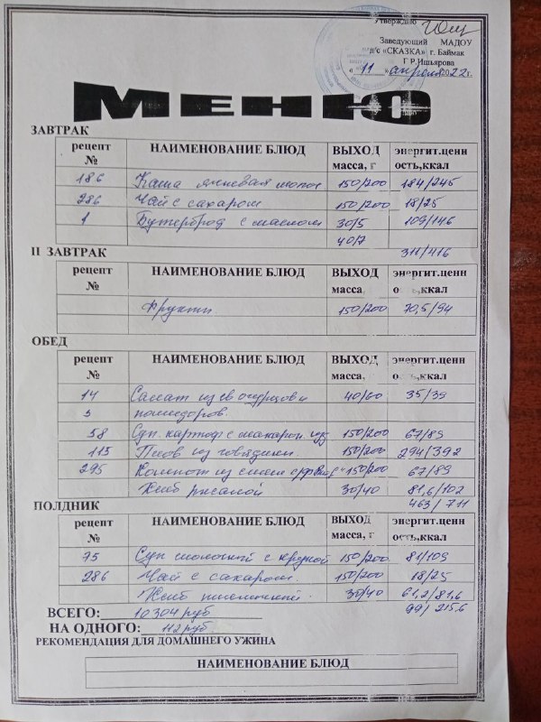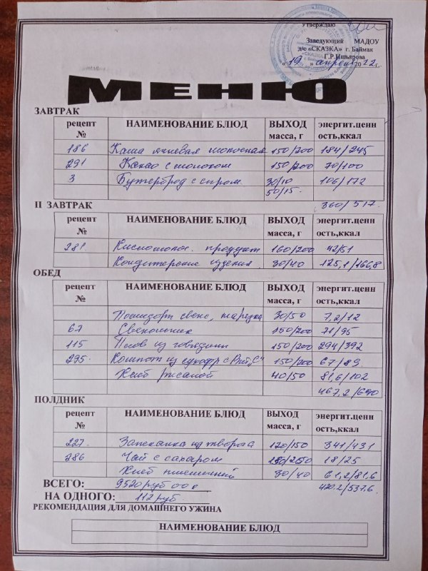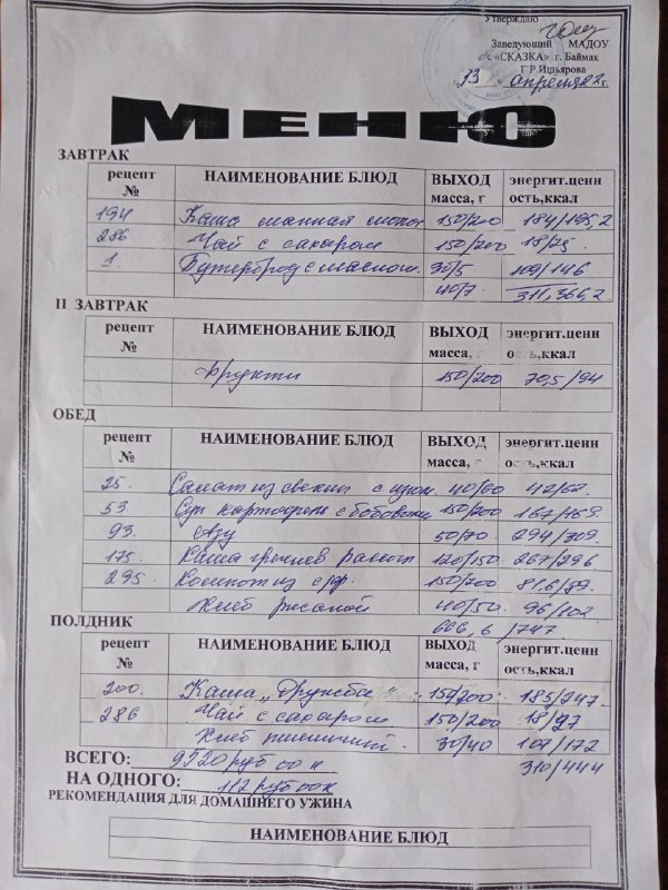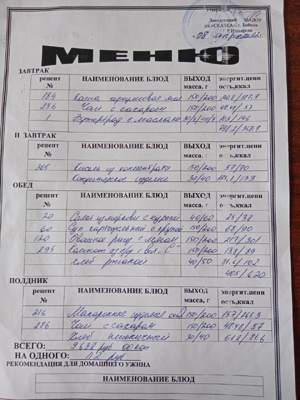 Ассортиментный перечень продуктов питания в детском саду "Сказка"