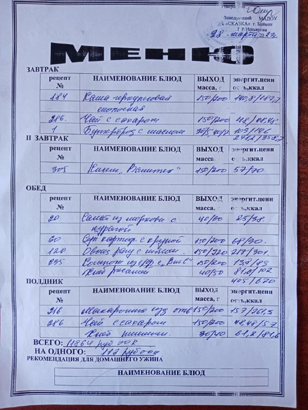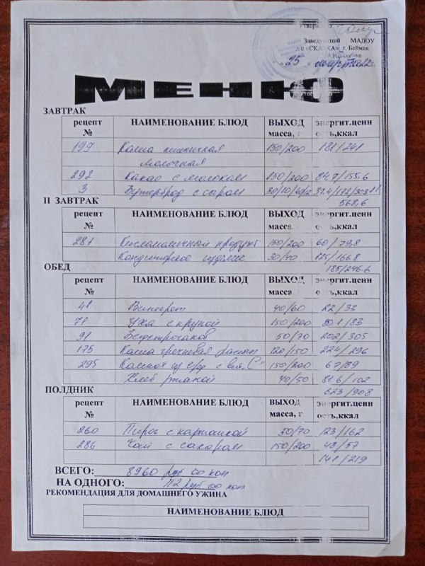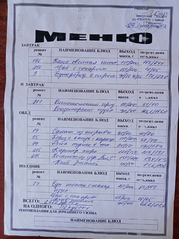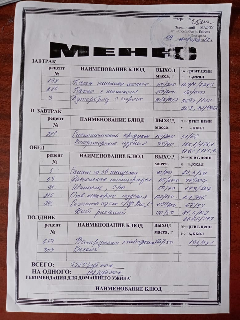 Ассортиментный перечень продуктов питания в детском саду "Сказка"
