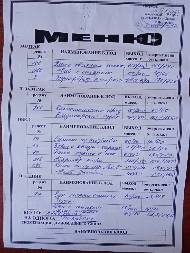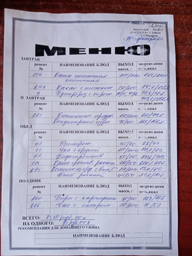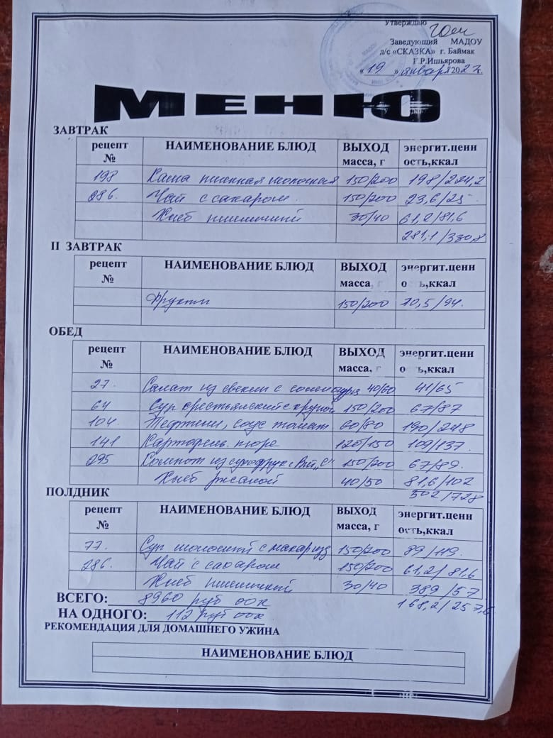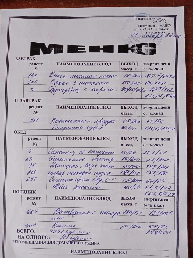 Ассортиментный перечень продуктов питания в детском саду "Сказка"