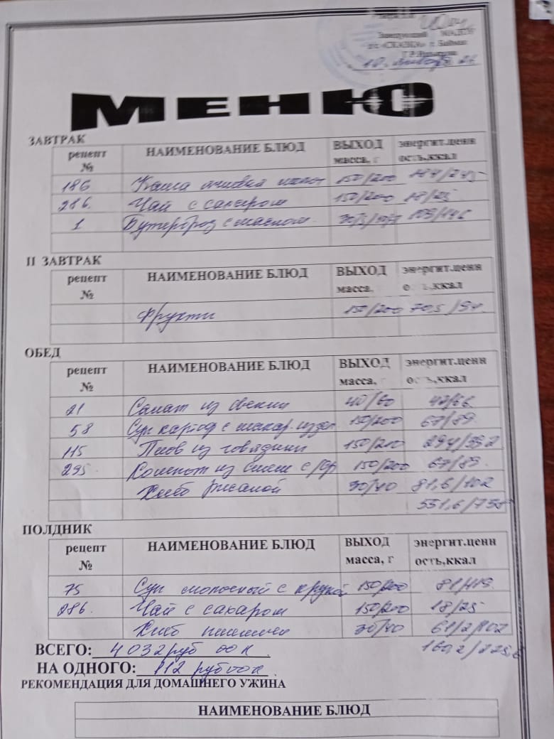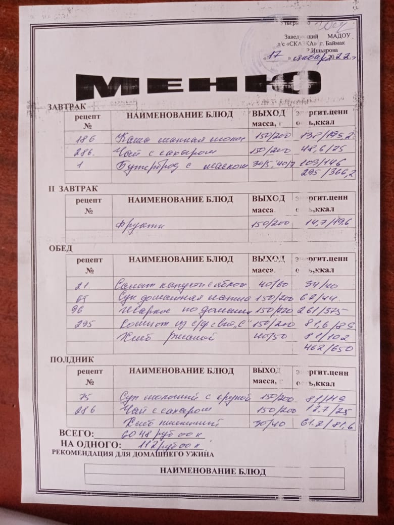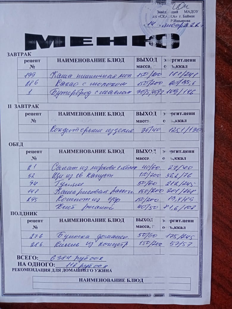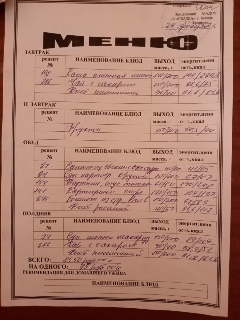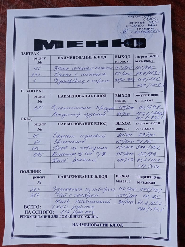 Ассортиментный перечень продуктов питания в детском саду "Сказка"