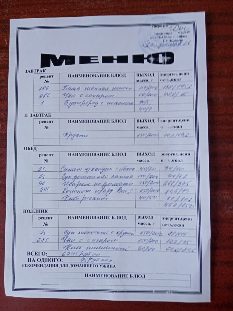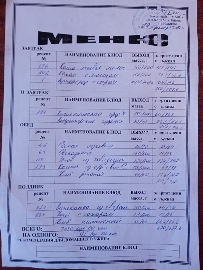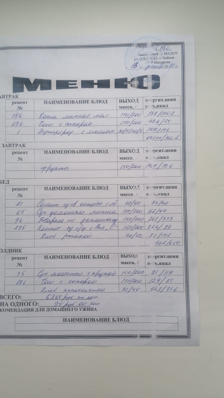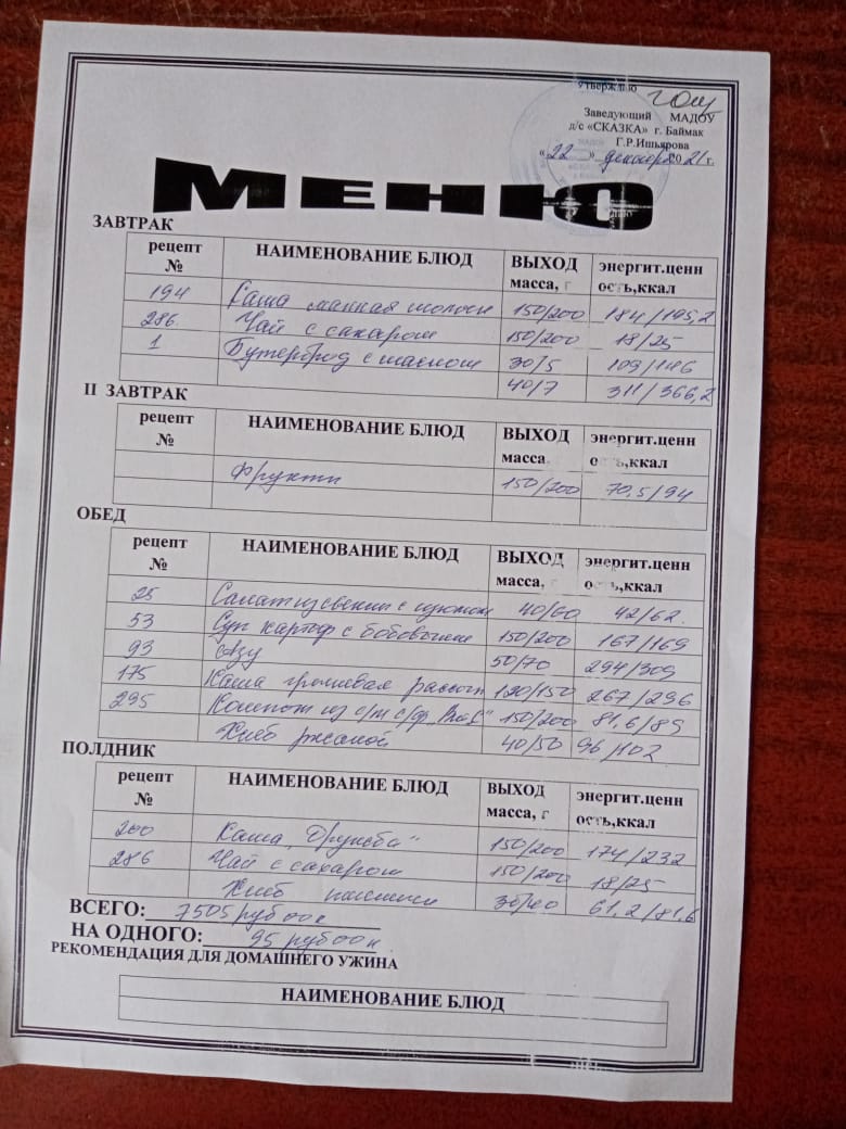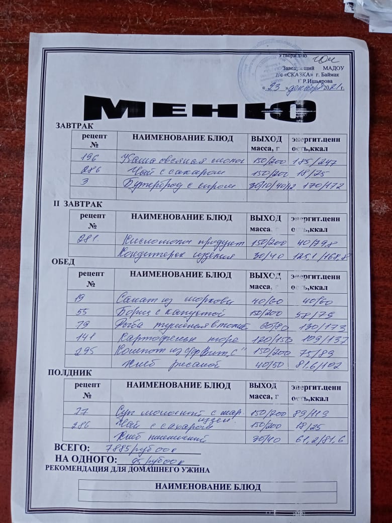 Ассортиментный перечень продуктов питания в детском саду "Сказка"