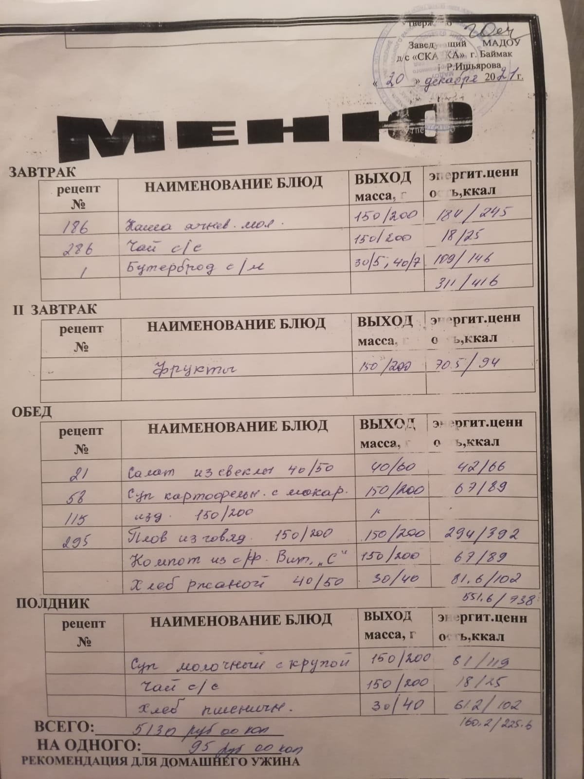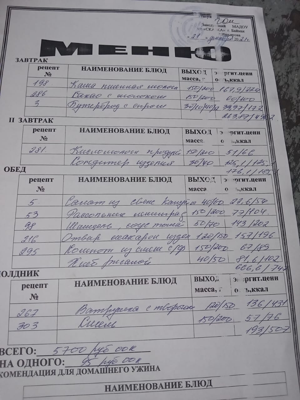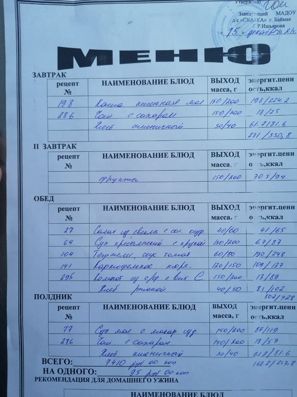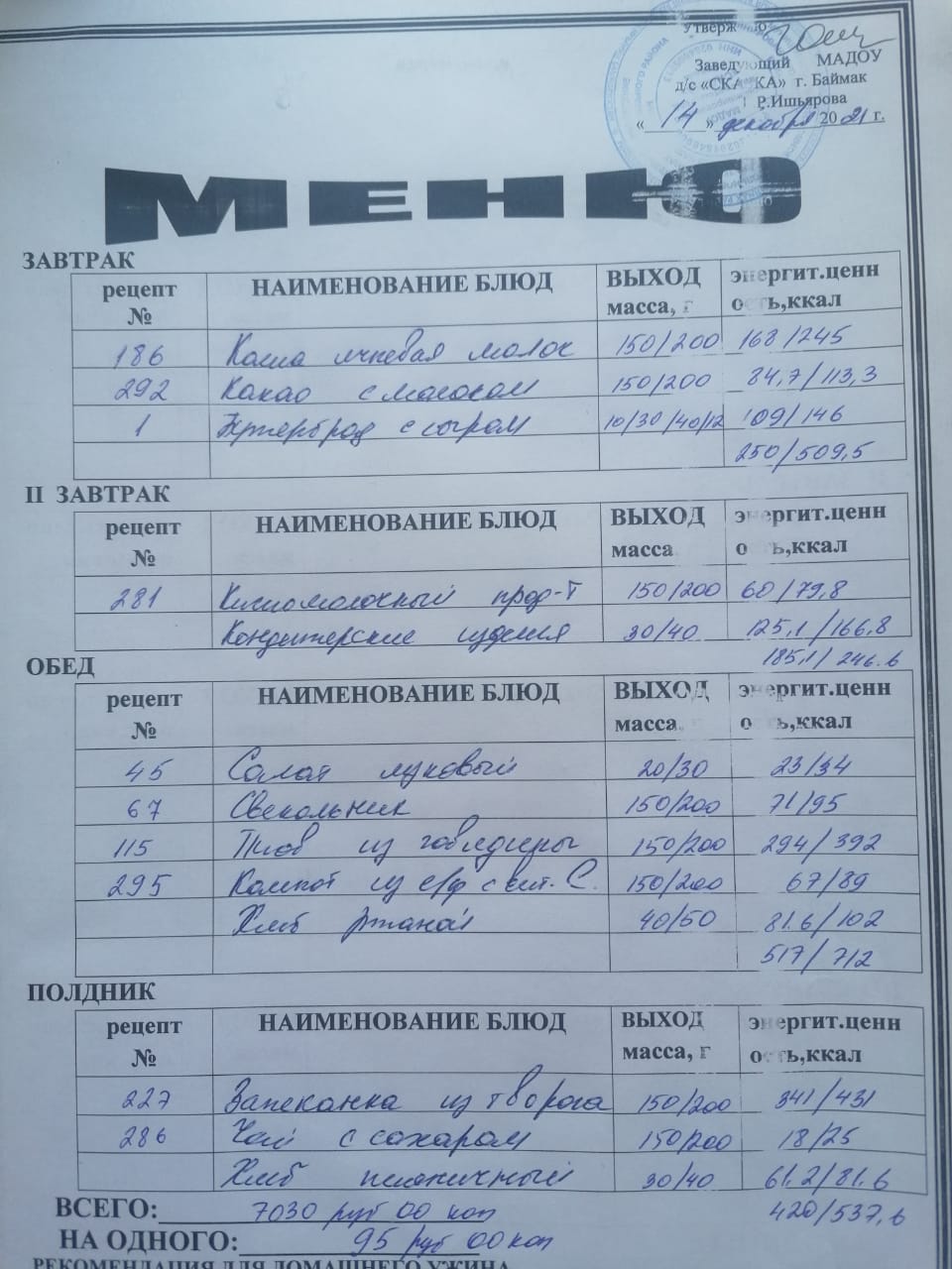Ассортиментный перечень продуктов питания в детском саду "Сказка"