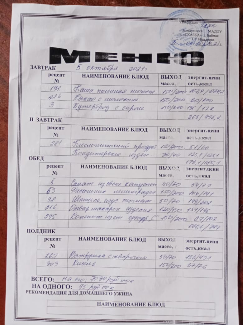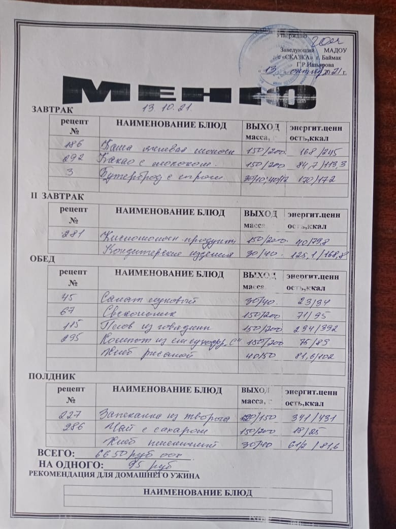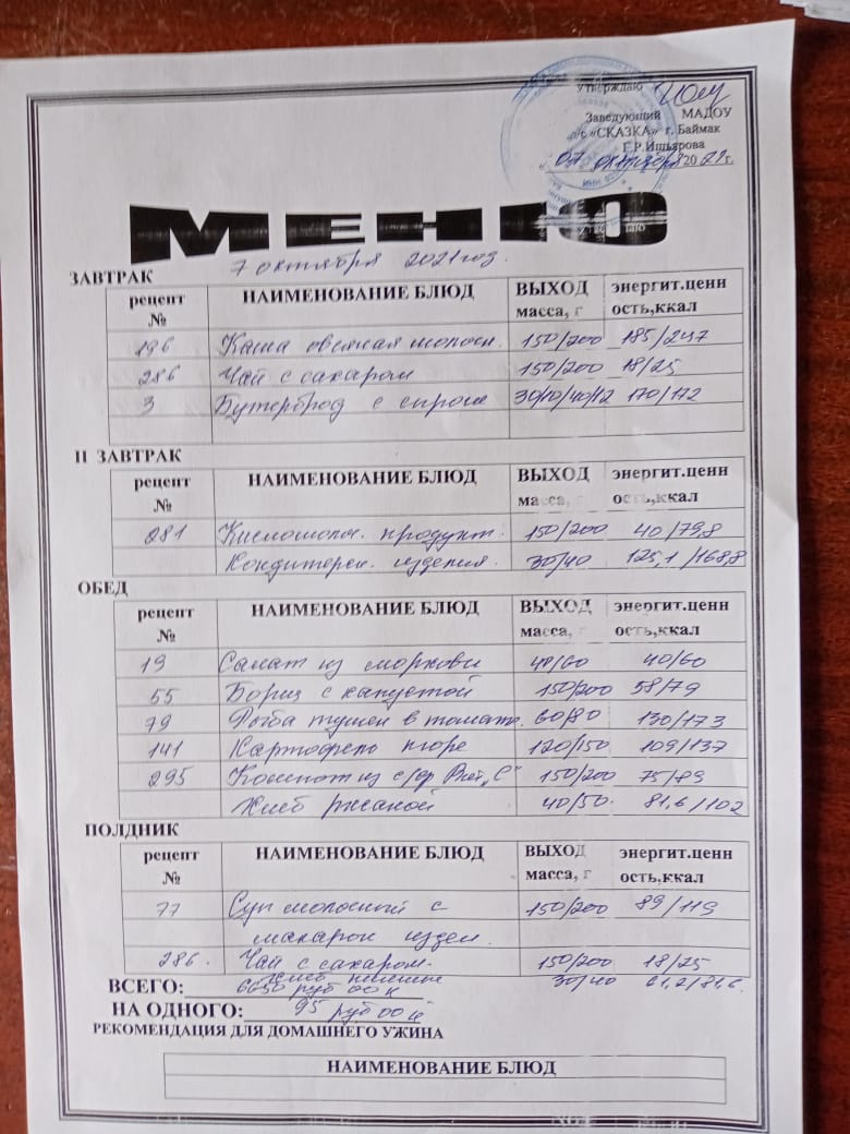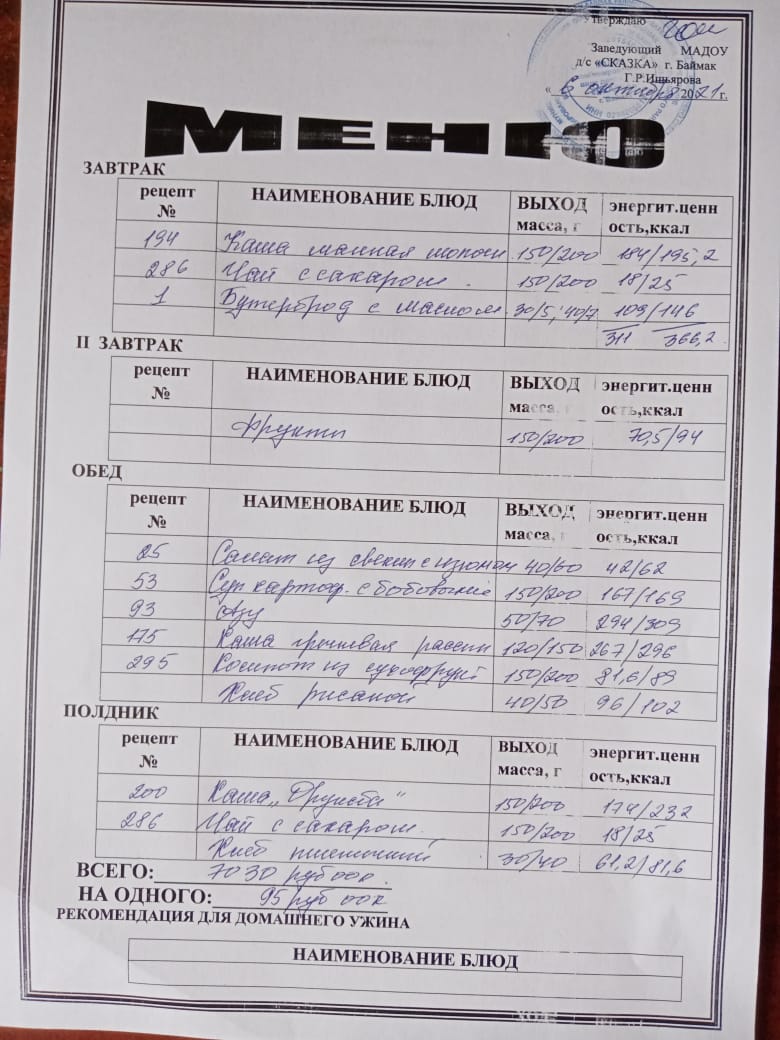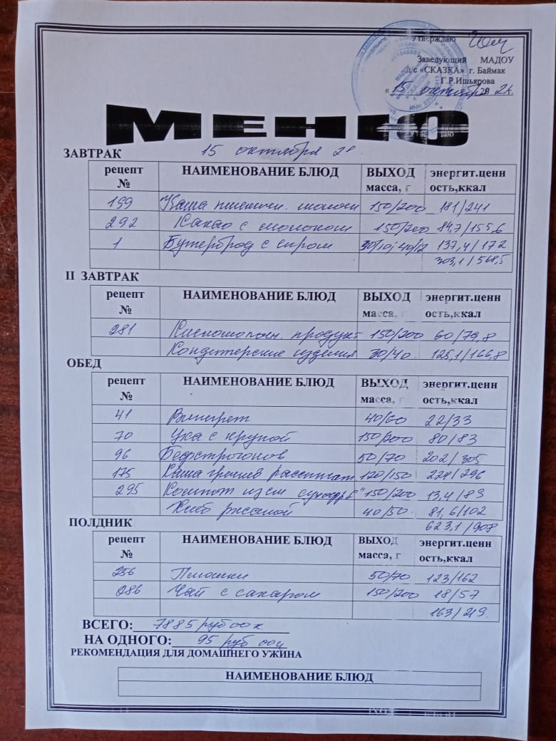 Ассортиментный перечень продуктов питания в детском саду "Сказка"