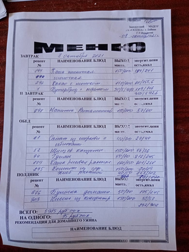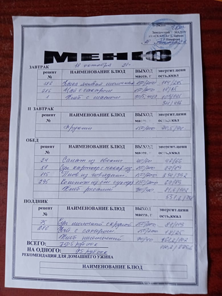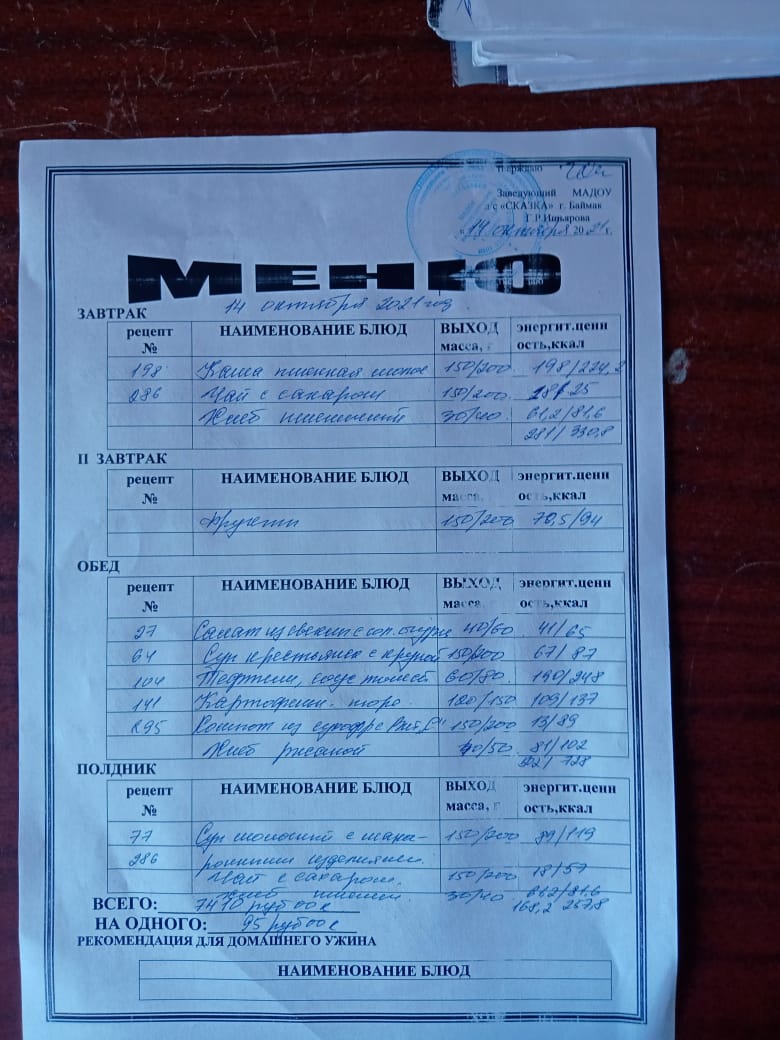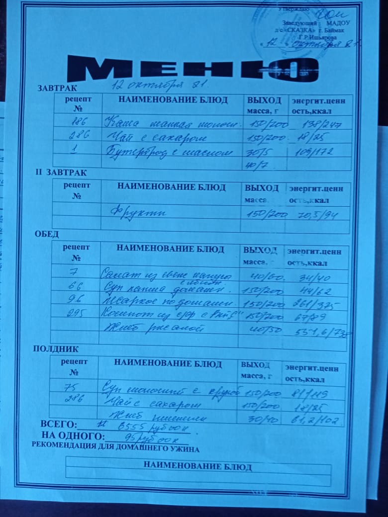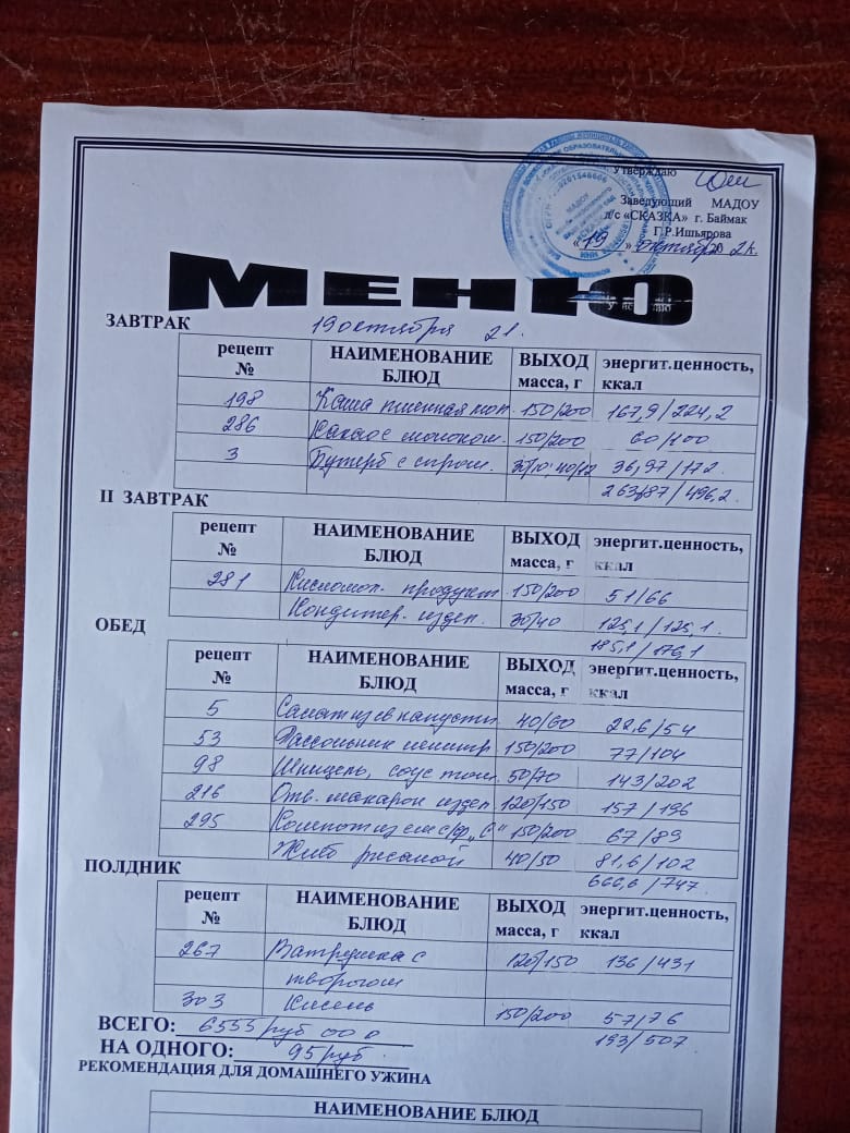 Ассортиментный перечень продуктов питания в детском саду "Сказка"