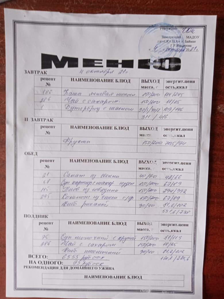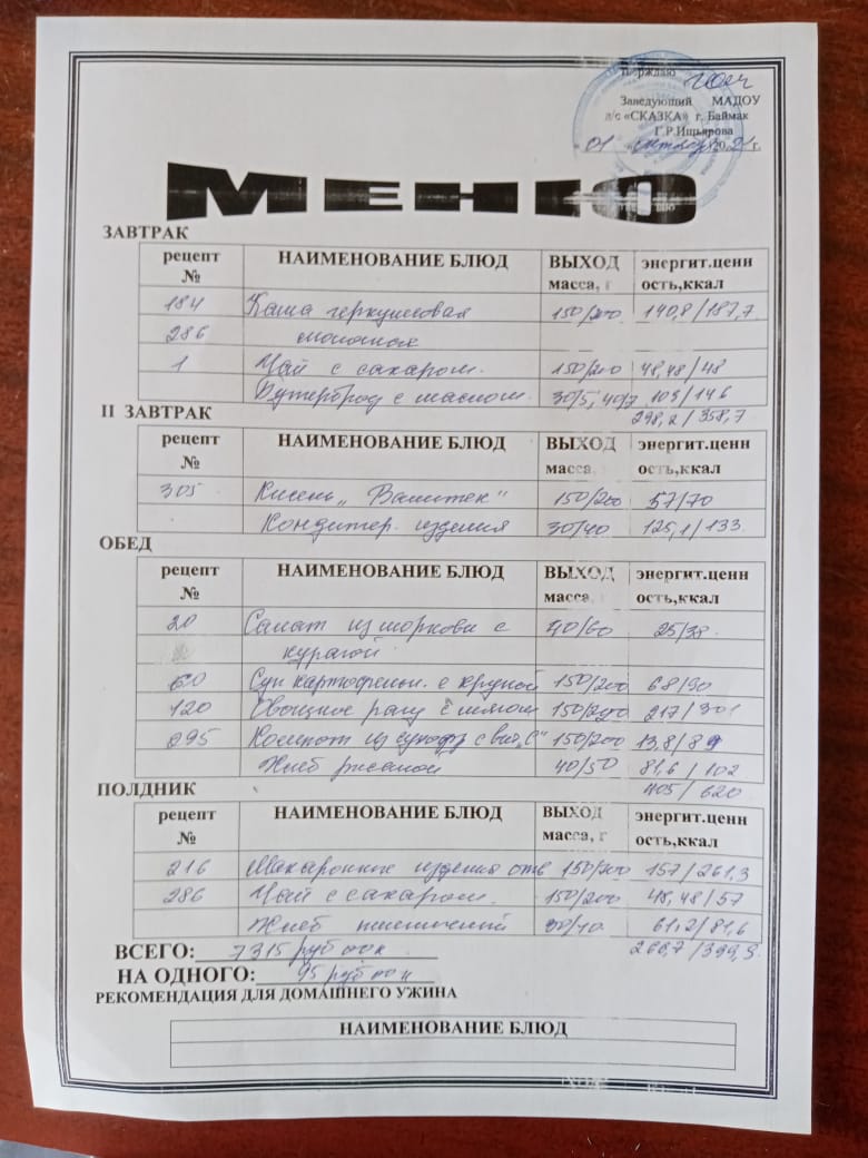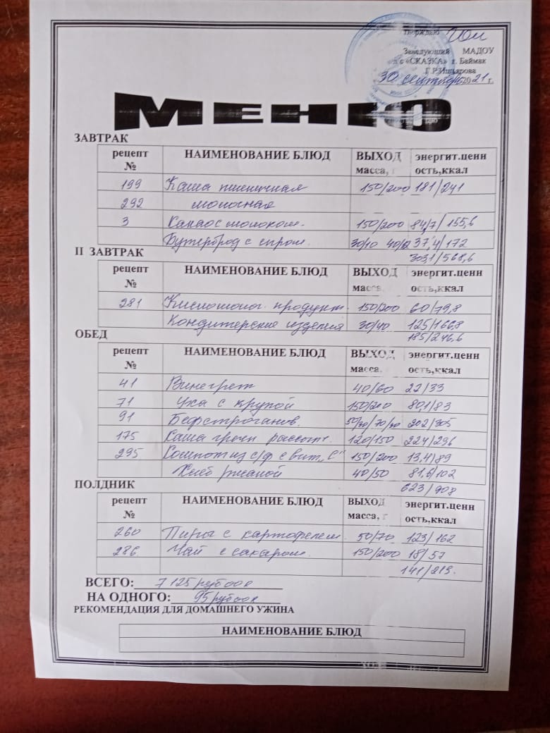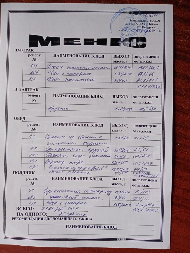 Ассортиментный перечень продуктов питания в детском саду "Сказка"