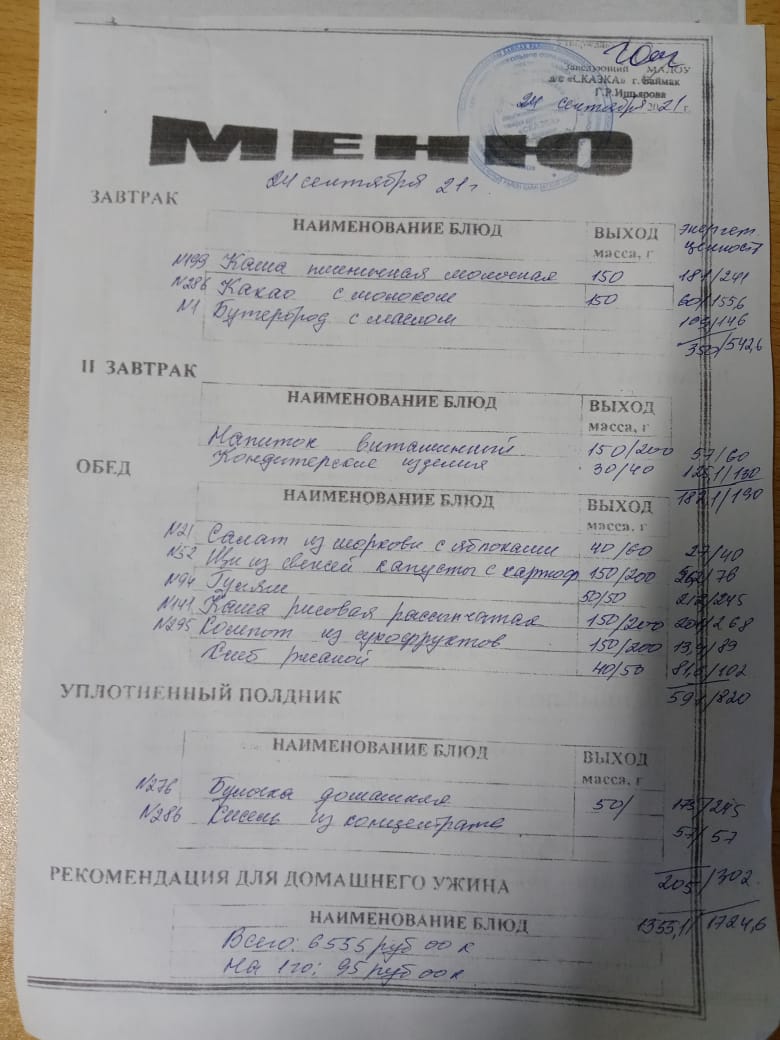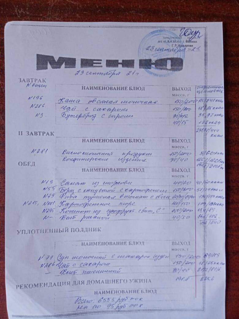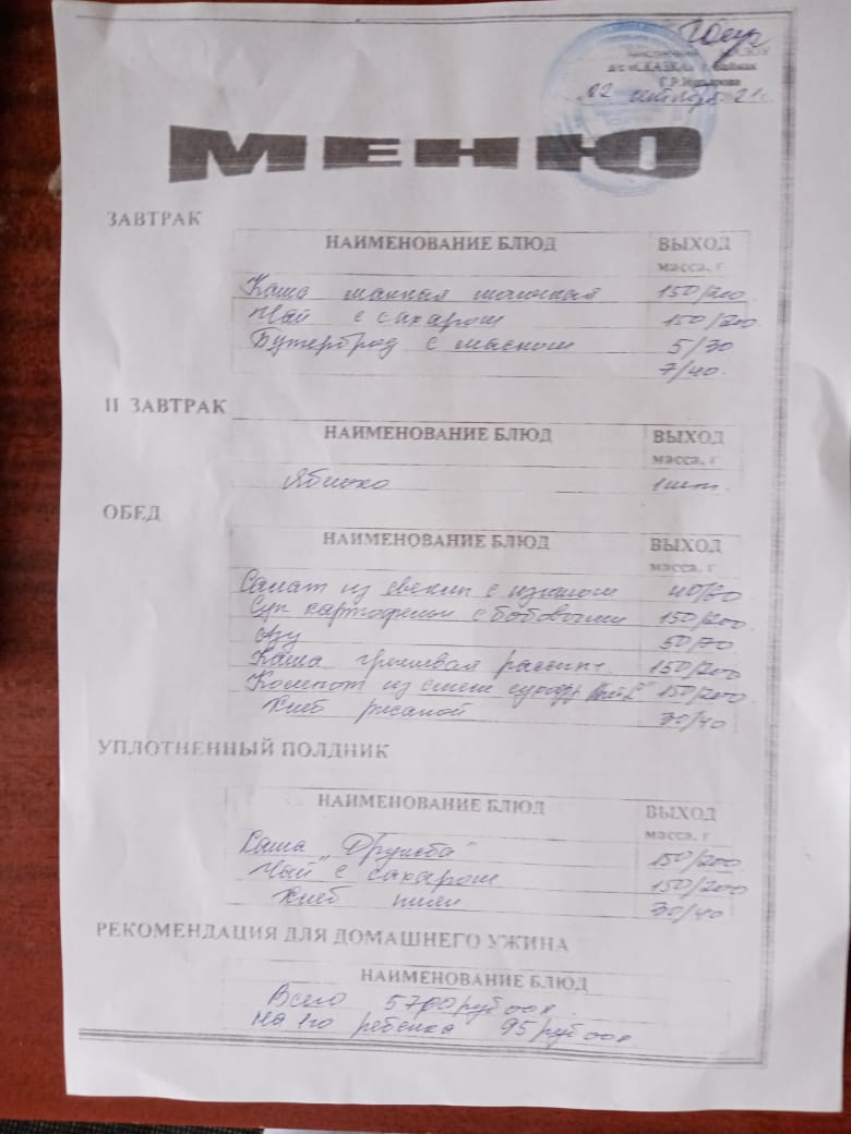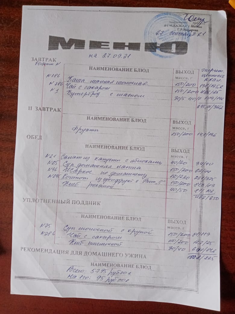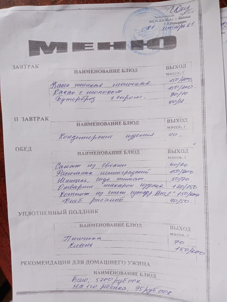 Ассортиментный перечень продуктов питания в детском саду "Сказка"