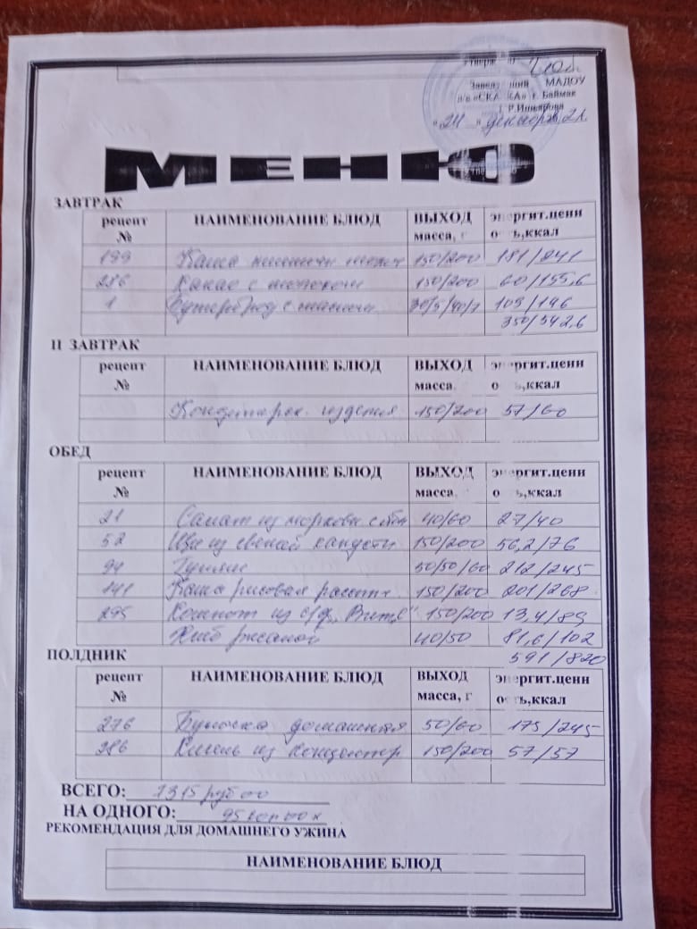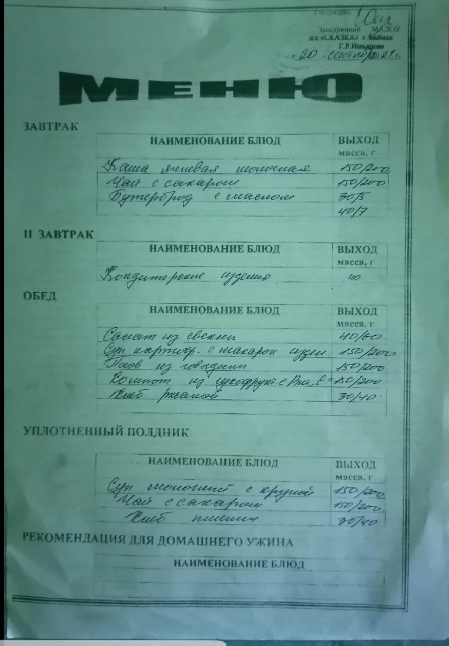 Ассортиментный перечень продуктов питания в детском саду "Сказка"